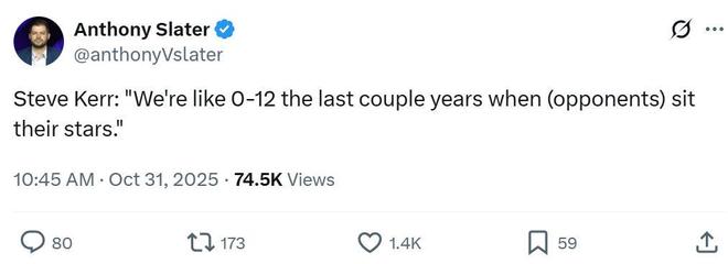 “过去几年,当对手当家球星缺席时,我们的战绩差不多是0胜12负,如果我是对手主帅,当面对勇士时也要轮休主将了”科尔补充道。