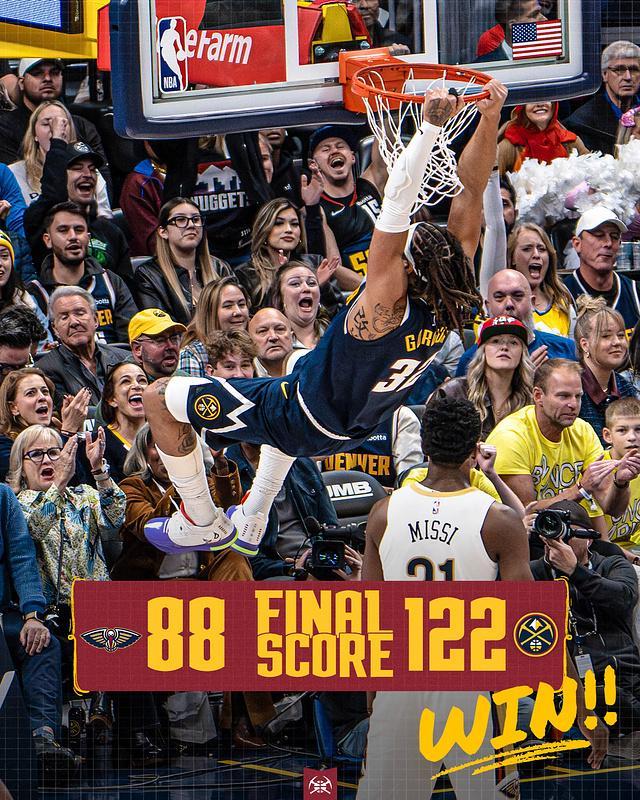 由于双方比分相差悬殊,第四节比赛提前进入垃圾时间,双方也是派上替补轮换阵容。末节双方均是单节轰下30分,最终掘金122-88大胜送鹈鹕开局4连败。