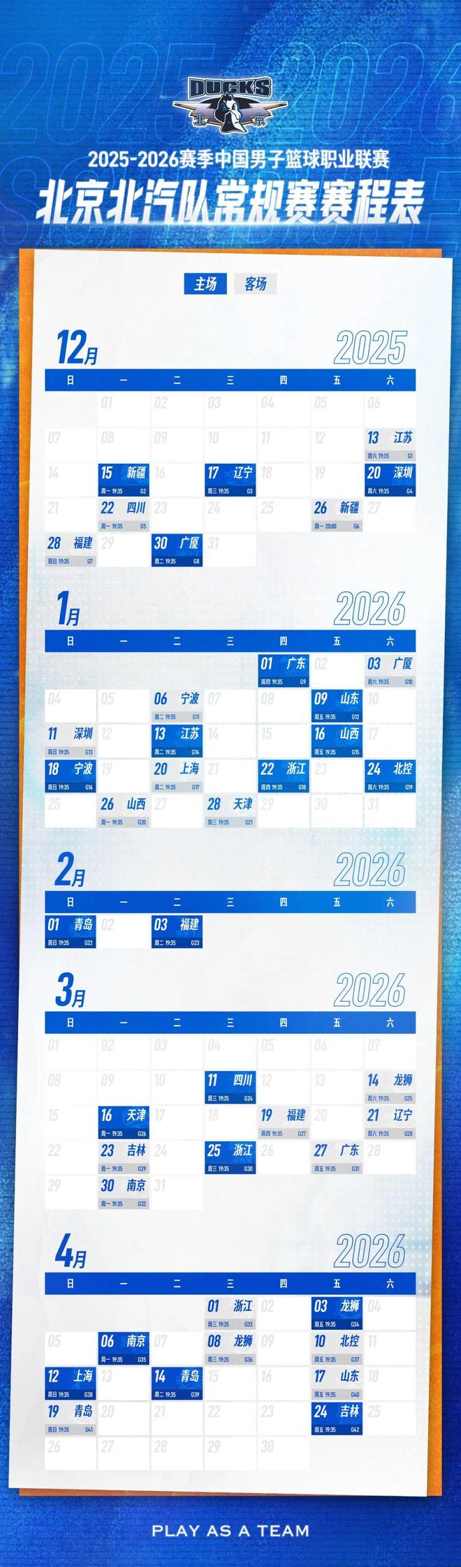 25-26赛季CBA战火重燃,北京北汽男篮将于12月13日吹响冲锋号角,首轮客场挑战江苏男篮,12月15日坐镇主场迎战新疆,历经42轮常规赛鏖战(主客场各21轮),向更高目标发起冲击。