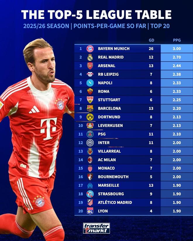 本赛季五大联赛场均积分:拜仁全胜第1,皇马、阿森纳二三位